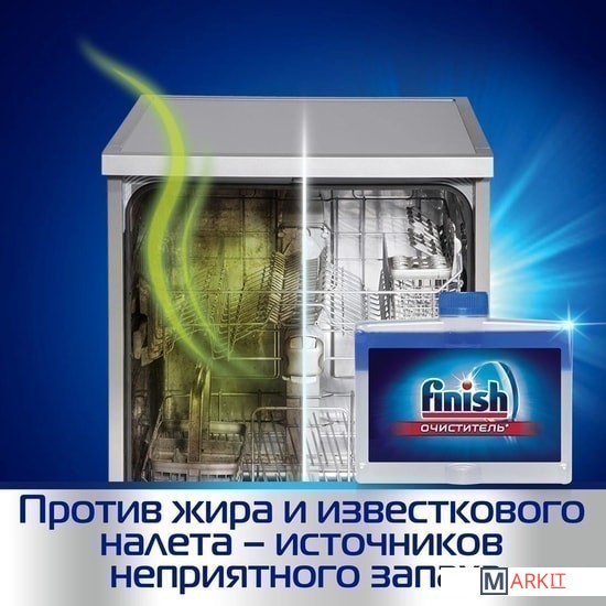 Очиститель для посудомоечных машин Finish удаляет жир и известковый налет в посудомоечной машине, и ваша посуда буквально сияет чистотой. Жир и известковый налет скапливаются на поверхности важнейших внутренних деталей посудомоечной машины, что оказывает влияние на качество мытья посуды.Очиститель Finish удаляет жир и известковый налет: благодаря ему ваша посудомоечная машина всегда идеально чистая и благоухает свежестью!